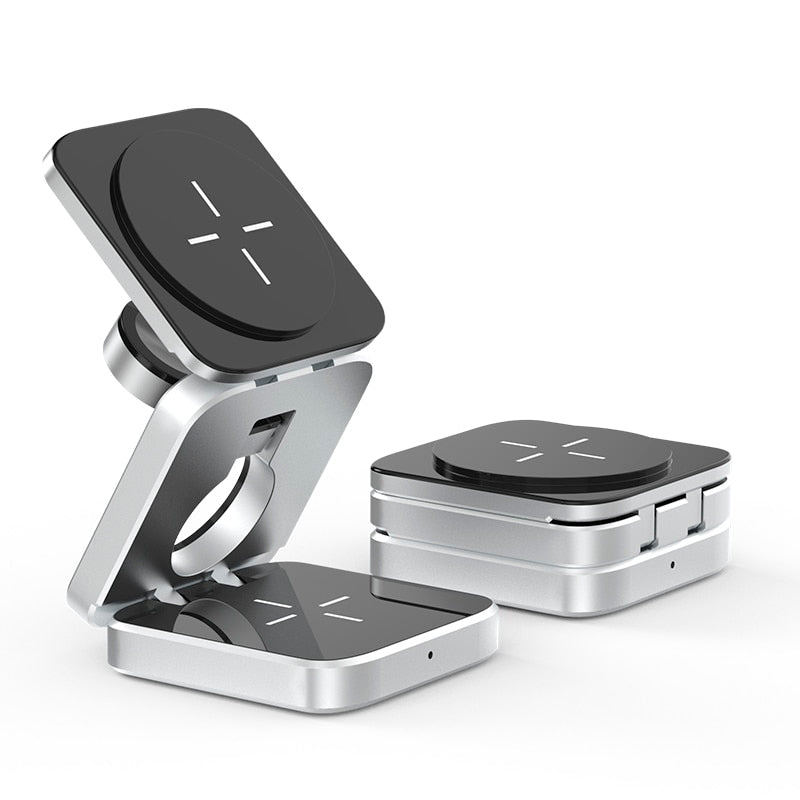 Carregue até três dispositivos de uma só vez com o  Carregador Magnético Dobrável sem fio 3 em 1 . Ele é compatível com iPhone, AirPod, iWatch e diversos outros aparelhos! Tenha praticidade e rapidez no carregamento.