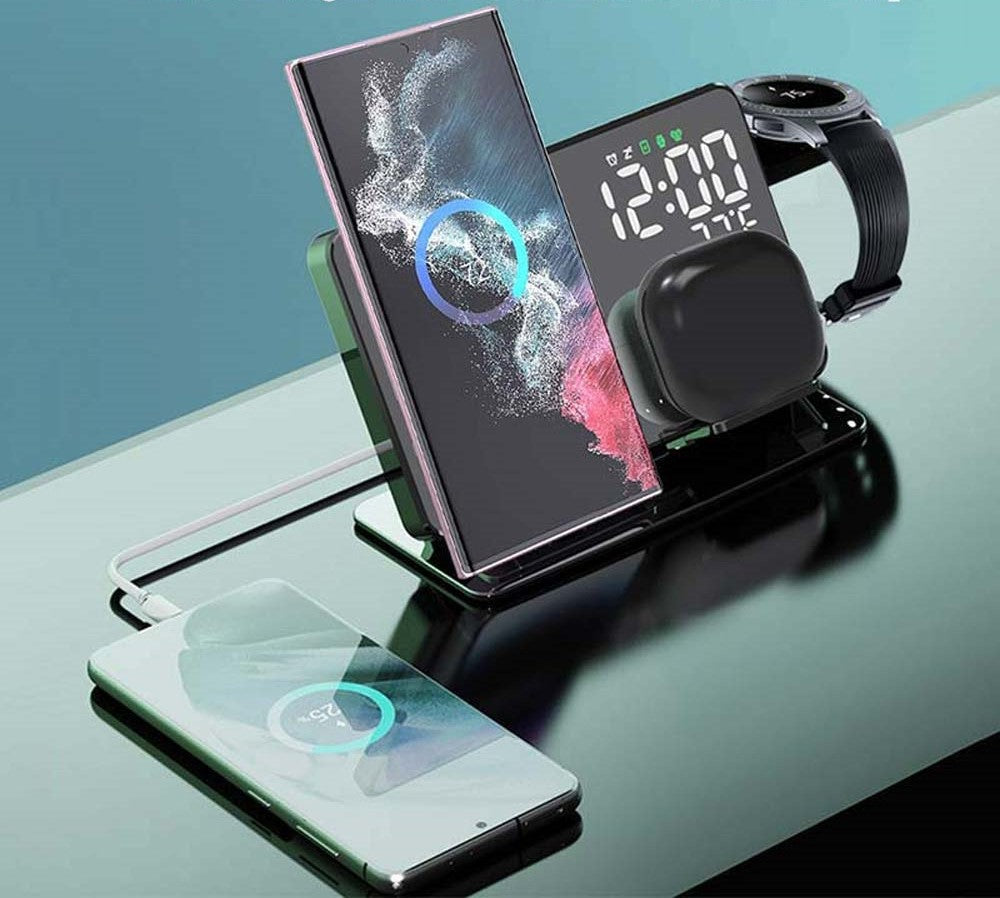 O Carregador sem fio 3 em 1 Samsung com Relógio Led é uma estação de carregamento que permite carregar 3 dispositivos ao mesmo tempo, com facilidade e sem aquela bagunça de cabos. Você pode carregar seu Samsung, seu Fone Bluetooth e seu Relógio Digital ao mesmo tempo.
