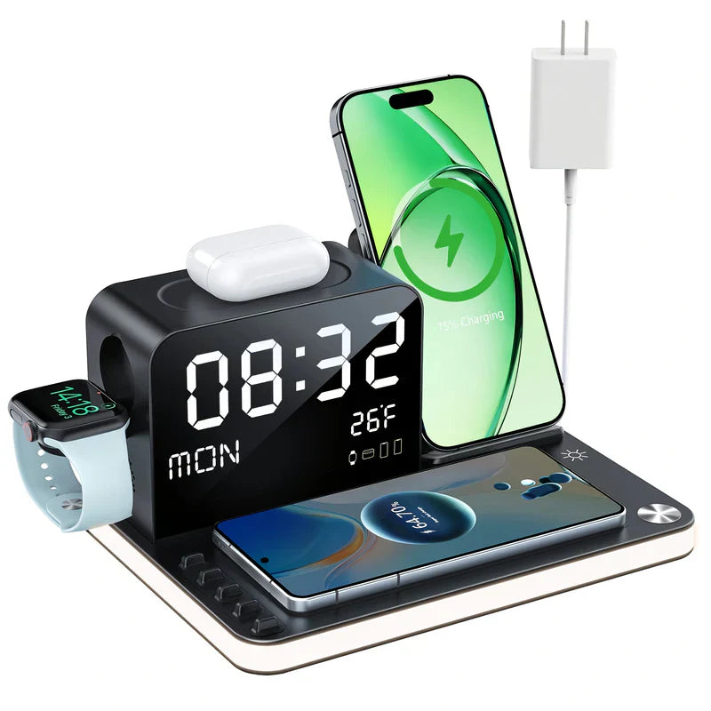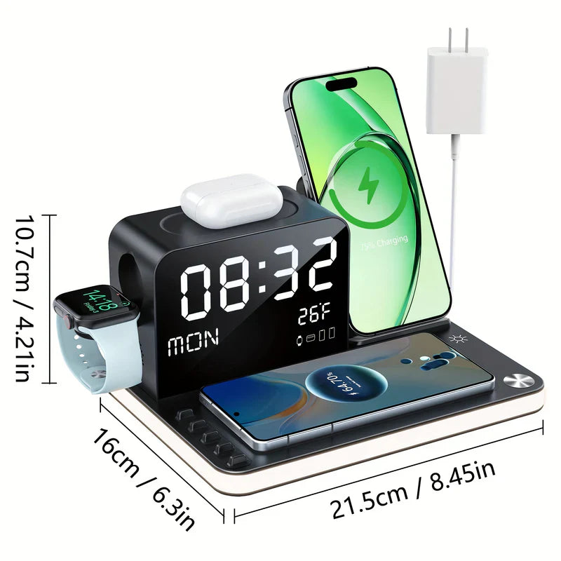 Carregue telefone, iWatch e fones de ouvido ao mesmo tempo com potência de 33W, tudo de uma vez com um hub elegante e compacto. Com relógio integrado, visor de temperatura e zonas sem fio, este é o upgrade completo que faltava na sua mesa de cabeceira ou escrivaninha. Praticidade, organização e eficiência em um só dispositivo — diga adeus aos cabos espalhados!