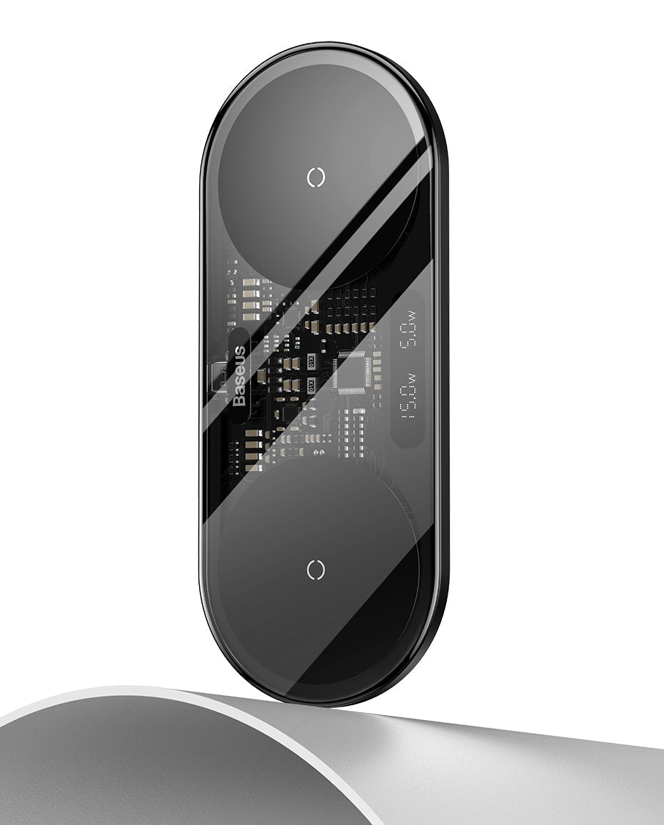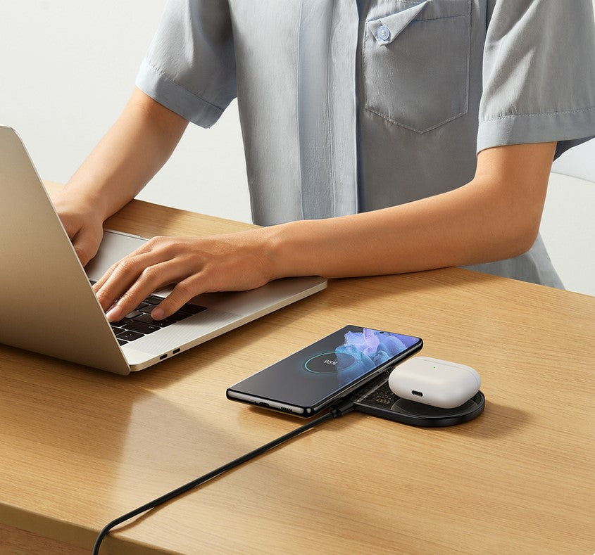 Com nosso Carregador sem fio 2 em 1 Baseus você pode carregar dois dispositivos ao mesmo tempo. Compatível com iPhone, Samsung, Xiaomi, AirPods e muito mais!